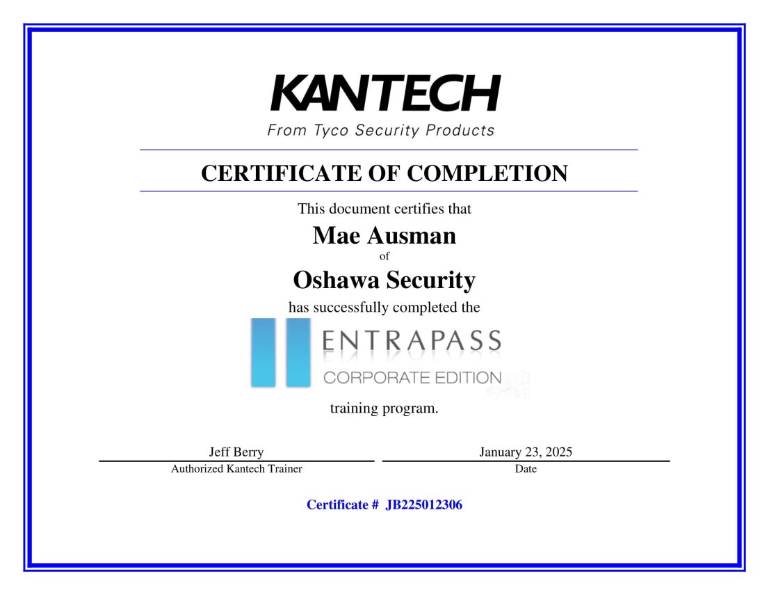 Mae's advanced skill set is validated by her prestigious Kantech Corporate Certification, a distinction that places her at the forefront of access control system programming. This certification signifies an elite level of proficiency in designing, configuring, and troubleshooting complex security networks, allowing Oshawa Security Systems to deliver enterprise-grade solutions with unwavering precision.